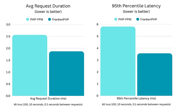 - میانگین تأخیر FrankenPHP کمتر و در حدود ۲ میلیثانیه